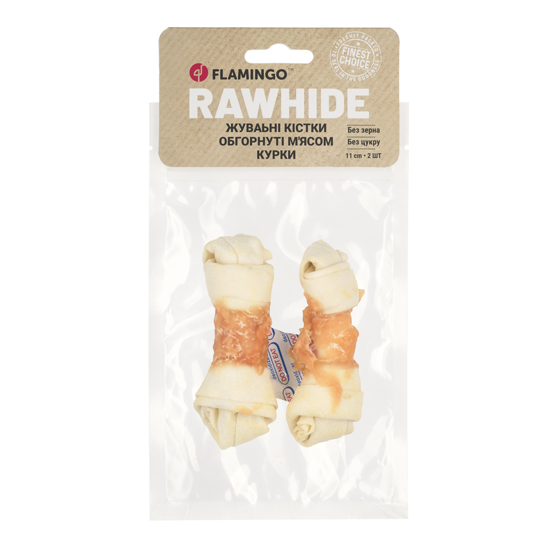 Ласощі Flamingo жувальні кістки обгорнуті м’ясом курки для собак11 см | 35 г | 2 шт | 70 гУявіть ідеальний перекус для Вашої собаки – жувальні кістки обгорнуті ніжним м’ясом куркивід яких будь-який улюбленець просто не зможе відірватися!Ласощі Flamingo – це 100% натуральні інгредієнти, максимум користі та задоволення у кожному шматочку, а все тому, що ми знаємо секрет ідеального перекусу!Ласощі виготовляються методом делікатного сушіння за контрольованих температур, що дозволяє зберегти максимум поживних речовин, смаку та аромату.Завдяки цій технології закуски є натуральними, без додавання консервантів, з тривалим терміном зберігання.Жувальні ласощі Flamingo – це смачний додаток до раціону улюбленця, який допомагає зняти стрес та природним чином доглянути за ротовою порожниною,запобігти утвореннюзубного каменю.Ідеальний вибір для щоденного частування з турботою про здоров’я!Чому варто обрати ласощі ТМ Flamingo?Високоякісний білокОсновою ласощів є натуральне м’ясо курки (26,5%), яке містить велику кількість білка та має низький вміст жиру, що робить їх ідеальним вибором для підтримки здоров’я та активності улюбленця.Вітамінний комплексМ’ясо курки містить цінні вітаміни та мінерали: B6, B12, залізо та цинк – важливі компоненти для здорового харчування улюбленця.Догляд за ротовою порожниноюВміст сиром’ятної шкіри (68%) ефективно допомагає очистити зубний наліт та підтримують гігієну ротової порожнини.Сповільнює процес поїданняЖувальні ласощі сповільнюють поїдання та занадто швидке проковтування, що покращує травлення та знижує ризик завороту кишок на 30-40%.Легке засвоєнняЗавдяки м’якій текстурі та складу ласощі легко перетравлюються, що робить їх ідеальним вибором для тварин з чутливим травленням.Безпечний складПродукт не містить глютену, цукру та штучних добавок, що мінімізує ризик виникнення алергічних реакцій.Надійне зберіганняВакуумна упаковка з поглиначем запаху та зручною zip-застібкою забезпечує довготривалу свіжість продукту.Склад:Сиром’ятна шкіра 68%, курка 26,5%, крохмаль батату 1,75%, гліцерин 1,75%, рослинний білок 1,75%, сіль 0,25%.Добавки:Добавки технологічні:Сорбат калію 0,1%.Аналітичний склад:Сирі жири: 2,5%. Сирий протеїн: 60%. Сира зола: 3,5%. Сира клітковина: 2%. Вологість: 16%.Спосіб застосування:рекомендовано для тварин віком від 4 місяців.Рекомендації з годуваннямаксимальна добова норма (гр на день) 10 кг 10 – 25 кг 25 кг 20 30 40Застереження:не використовувати у разі індивідуальної непереносиності інгредієнтів. Продукт не є повноцінним харчуванням і має даватися виключно як доповнення до основного раціону.Умови зберігання:зберігати засіб у темному сухому приміщенні, окремо від харчових продуктів при температурі від 5 °С до 25 °С.Фасування:2 кістки × 35 г (загальна вага 70 г), довжина 11 см.Термін придатності:3 рокиТоргівельна марка:FlamingoКраїна виробник:Бельгія