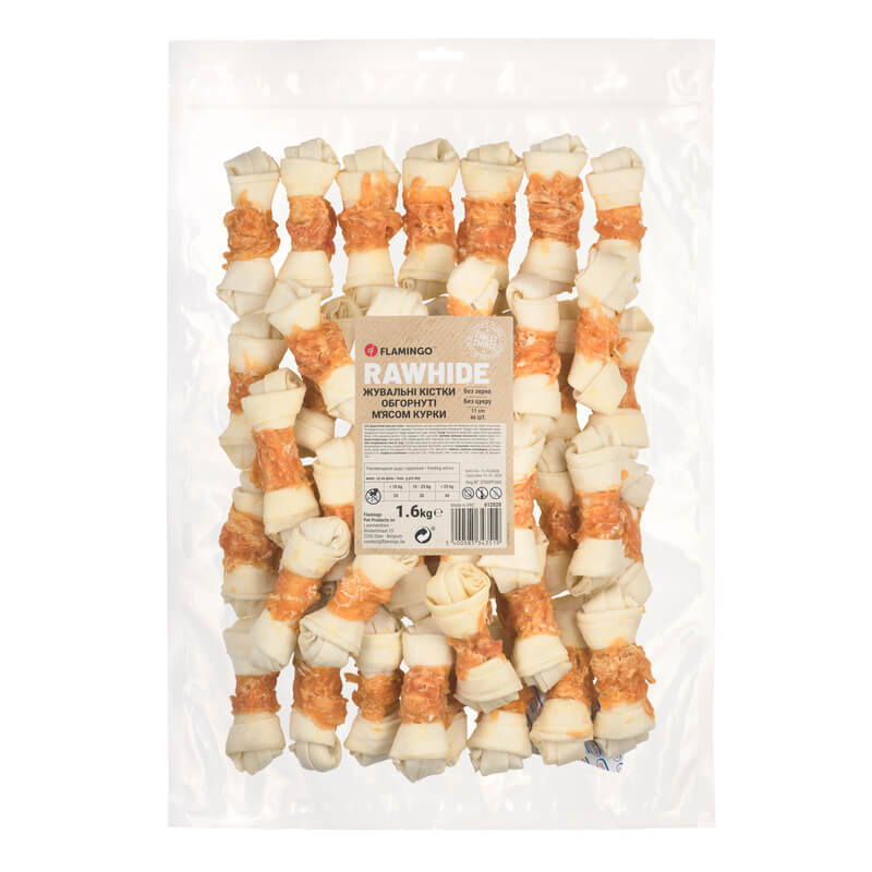 Ласощі Flamingo жувальні кістки обгорнуті м’ясом курки для собак11 см | 35 г | 46 шт | 1.6 кгУявіть ідеальний перекус для Вашої собаки – жувальні кістки обгорнуті ніжнимм’ясом куркивід яких будь-який улюбленець просто не зможе відірватися!Ласощі Flamingo – це 100% натуральні інгредієнти, максимум користі та задоволення у кожному шматочку, а все тому, що ми знаємо секрет ідеального перекусу!Ласощі виготовляються методом делікатного сушіння за контрольованих температур, що дозволяє зберегти максимум поживних речовин, смаку та аромату.Завдяки цій технології закуски є натуральними, без додавання консервантів, з тривалим терміном зберігання.Жувальні ласощі Flamingo – це смачний додаток до раціону улюбленця, який допомагає зняти стрес та природним чином доглянути за ротовою порожниною,запобігти утвореннюзубного каменю.Ідеальний вибір для щоденного частування з турботою про здоров’я!Чому варто обрати ласощі ТМ Flamingo?Високоякісний білокОсновою ласощів є натуральне м’ясо курки (26,5%), яке містить велику кількість білка та має низький вміст жиру, що робить їх ідеальним вибором для підтримки здоров’я та активності улюбленця.Вітамінний комплексМ’ясо курки містить цінні вітаміни та мінерали: B6, B12, залізо та цинк – важливі компоненти для здорового харчування улюбленця.Догляд за ротовою порожниноюВміст сиром’ятної шкіри (68%) ефективно допомагає очистити зубний наліт та підтримують гігієну ротової порожнини.Сповільнює процес поїданняЖувальні ласощі сповільнюють поїдання та занадто швидке проковтування, що покращує травлення та знижує ризик завороту кишок на 30-40%.Легке засвоєнняЗавдяки м’якій текстурі та складу ласощі легко перетравлюються, що робить їх ідеальним вибором для тварин з чутливим травленням.Безпечний складПродукт не містить глютену, цукру та штучних добавок, що мінімізує ризик виникнення алергічних реакцій.Надійне зберіганняВакуумна упаковка з поглиначем запаху та зручною zip-застібкою забезпечує довготривалу свіжість продукту.Склад:Сиром’ятна шкіра 68%, курка 26,5%, крохмаль батату 1,75%, гліцерин 1,75%, рослинний білок 1,75%, сіль 0,25%.Добавки:Добавки технологічні:Сорбат калію 0,1%.Аналітичний склад:Сирі жири: 2,5%. Сирий протеїн: 60%. Сира зола: 3,5%. Сира клітковина: 2%. Вологість: 16%.Спосіб застосування:рекомендовано для тварин віком від 4 місяців.Рекомендації з годуваннямаксимальна добова норма (гр на день) 10 кг 10 – 25 кг 25 кг 20 30 40Застереження:не використовувати у разі індивідуальної непереносиності інгредієнтів. Продукт не є повноцінним харчуванням і має даватися виключно як доповнення до основного раціону.Умови зберігання:зберігати засіб у темному сухому приміщенні, окремо від харчових продуктів при температурі від 5 °С до 25 °С.Фасування:46 кістки × 35 г (загальна вага 1.6 г), довжина 11 см.Термін придатності:3 рокиТоргівельна марка:FlamingoКраїна виробник:Бельгія