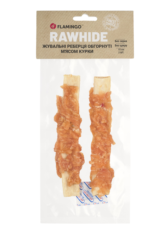 Ласощі Flamingo жувальні реберця обгорнуті м’ясом курки для собак15 см | 55 г | 2 шт | 110 гУявіть ідеальний перекус для Вашої собаки – жувальні реберця обгорнуті ніжним м’ясом курки від яких будь-який улюбленець просто не зможе відірватися!Ласощі Flamingo – це 100% натуральні інгредієнти, максимум користі та задоволення у кожному шматочку, а все тому, що ми знаємо секрет ідеального перекусу!Ласощі виготовляються методом делікатного сушіння за контрольованих температур, що дозволяє зберегти максимум поживних речовин, смаку та аромату.Завдяки цій технології закуски є натуральними, без додавання консервантів, з тривалим терміном зберігання.Жувальні ласощі Flamingo – це смачний додаток до раціону улюбленця, який допомагає зняти стрес та природним чином доглянути за ротовою порожниною,запобігти утвореннюзубного каменю.Ідеальний вибір для щоденного частування з турботою про здоров’я!Чому варто обрати ласощі ТМ Flamingo?Високоякісний білокОсновою ласощів є натуральне м’ясо курки (26,5%), яке містить велику кількість білка та має низький вміст жиру, що робить їх ідеальним вибором для підтримки здоров’я та активності улюбленця.Вітамінний комплексМ’ясо курки містить цінні вітаміни та мінерали: B6, B12, залізо та цинк – важливі компоненти для здорового харчування улюбленця.Догляд за ротовою порожниноюВміст сиром’ятної шкіри (68%) ефективно допомагає очистити зубний наліт та підтримують гігієну ротової порожнини.Сповільнює процес поїданняЖувальні ласощі сповільнюють поїдання та занадто швидке проковтування, що покращує травлення та знижує ризик завороту кишок на 30-40%.Легке засвоєнняЗавдяки м’якій текстурі та складу ласощі легко перетравлюються, що робить їх ідеальним вибором для тварин з чутливим травленням.Безпечний складПродукт не містить глютену, цукру та штучних добавок, що мінімізує ризик виникнення алергічних реакцій.Надійне зберіганняВакуумна упаковка з поглиначем запаху та зручною zip-застібкою забезпечує довготривалу свіжість продукту.Склад:Сиром’ятна шкіра 68%, курка 26,5%, крохмаль батату 1,75%, гліцерин 1,75%, рослинний білок 1,75%, сіль 0,25%.Добавки:Добавки технологічні:Сорбат калію 0,1%.Аналітичний склад: Сирі жири: 2,5%. Сирий протеїн: 60%. Сира зола: 3,5%. Сира клітковина: 2%. Вологість: 16%.Спосіб застосування:рекомендовано для тварин віком від 4 місяців.Рекомендації з годуваннямаксимальна добова норма (гр на день) 10 кг 10 – 25 кг 25 кг 20 30 40Застереження:не використовувати у разі індивідуальної непереносиності інгредієнтів. Продукт не є повноцінним харчуванням і має даватися виключно як доповнення до основного раціону.Умови зберігання:зберігати засіб у темному сухому приміщенні, окремо від харчових продуктів при температурі від 5 °С до 25 °С.Фасування:3 реберця× 55 г (загальна вага 110 г), довжина 15 см.Термін придатності:3 рокиТоргівельна марка:FlamingoКраїна виробник:Бельгія