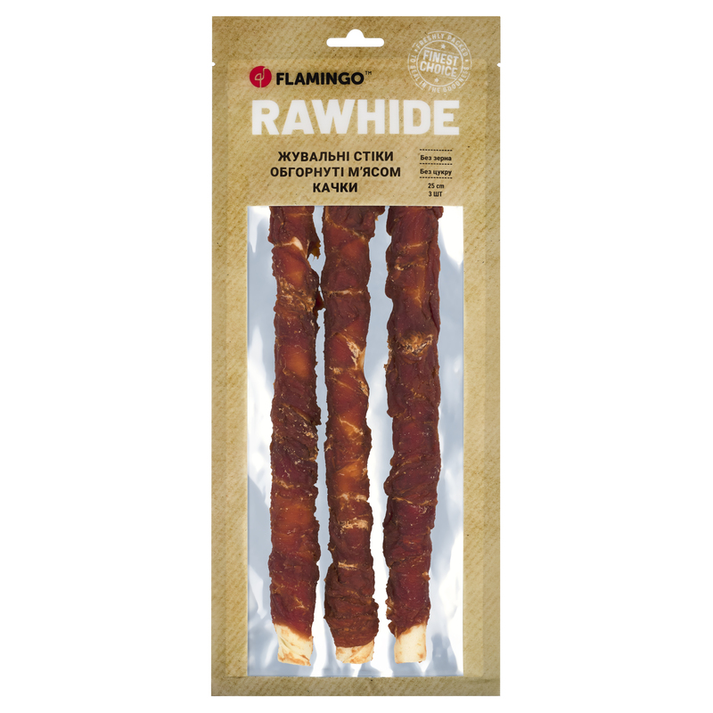 Ласощі Flamingo жувальні стіки обгорнуті м’ясом качки для собак25 см | 80 г | 3 шт | 240 гУявіть ідеальний перекус для Вашої собаки – жувальні стіки обгорнуті ніжнимм’ясом качкивід яких будь-який улюбленець просто не зможе відірватися!Ласощі Flamingo – це 100% натуральні інгредієнти, максимум користі та задоволення у кожному шматочку, а все тому, що ми знаємо секрет ідеального перекусу!Ласощі виготовляються методом делікатного сушіння за контрольованих температур, що дозволяє зберегти максимум поживних речовин, смаку та аромату.Завдяки цій технології закуски є натуральними, без додавання консервантів, з тривалим терміном зберігання.Жувальні ласощі Flamingo – це смачний додаток до раціону улюбленця, який допомагає зняти стрес та природним чином доглянути за ротовою порожниною,запобігти утвореннюзубного каменю.Ідеальний вибір для щоденного частування з турботою про здоров’я!Чому варто обрати ласощі ТМ Flamingo?Високоякісний білокОсновою ласощів є натуральне м’ясо качки (36%), яке містить велику кількість білка та має низький вміст жиру, що робить їх ідеальним вибором для підтримки здоров’я та активності улюбленця.Вітамінний комплексМ’ясо качки містить потужний вітамінно-мінеральний комплекс: вітаміни групи В, залізо, цинк та жирні кислоти омега-3 і 6, які сприяють здоровому обміну речовин, підтримці імунітету та блискучому стану шерсті улюбленця.Догляд за ротовою порожниноюВміст сиром’ятної шкіри (60%) ефективно допомагає очистити зубний наліт та підтримують гігієну ротової порожнини.Сповільнює процес поїданняЖувальні ласощі сповільнюють поїдання та занадто швидке проковтування, що покращує травлення та знижує ризик завороту кишок на 30-40%.Легке засвоєнняЗавдяки м’якій текстурі та складу ласощі легко перетравлюються, що робить їх ідеальним вибором для тварин з чутливим травленням.Безпечний складПродукт не містить глютену, цукру та штучних добавок, що мінімізує ризик виникнення алергічних реакцій.Надійне зберіганняВакуумна упаковка з поглиначем запаху та зручною zip-застібкою забезпечує довготривалу свіжість продукту.Склад:Сиром’ятна шкіра 60%, качка 36%, рослинний білок 1,5%, гліцерин 1,25%, крохмаль батату 1%, сіль 0,25%.Аналітичний склад:Сирі жири: 2%. Сирий протеїн: 58%. Сира зола: 3%. Сира клітковина: 2,5%. Вологість: 18%.Спосіб застосування:рекомендовано для тварин віком від 4 місяців.Рекомендації з годуваннямаксимальна добова норма (гр на день) 10 кг 10 – 25 кг 25 кг 20 30 40Застереження:не використовувати у разі індивідуальної непереносиності інгредієнтів. Продукт не є повноцінним харчуванням і має даватися виключно як доповнення до основного раціону.Умови зберігання:зберігати засіб у темному сухому приміщенні, окремо від харчових продуктів при температурі від 5 °С до 25 °С.Фасування:3 стіки × 80 г (загальна вага 240 г), довжина 25 см.Термін придатності:3 рокиТоргівельна марка:FlamingoКраїна виробник:Бельгія