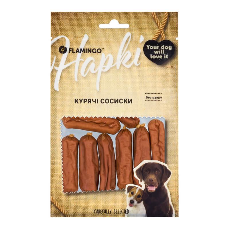 Ласощі Flamingo сосиски з м’ясом курки для собак75 гУявіть ідеальний перекус для Вашої собаки – смачні сосиски з ніжним м’ясом курки від яких будь-який улюбленець просто не зможе відірватися!Ласощі Flamingo – це 100% натуральні інгредієнти, максимум користі та задоволення у кожному шматочку, а все тому, що ми знаємо секрет ідеального перекусу!Ласощі виготовляються методом делікатного сушіння за контрольованих температур, що дозволяє зберегти максимум поживних речовин, смаку та аромату.Завдяки цій технології закуски є натуральними, без додавання консервантів, з тривалим терміном зберігання.Ласощі Flamingo ідеально підійдуть як додаткове заохочення під час тренувань, а також стануть приємним щоденним бонусом для вихованця.Чому варто обрати ласощі ТМ Flamingo?Високоякісний білокОсновою ласощів є натуральне м’ясо курки (86%), яке містить велику кількість білка та має низький вміст жиру, що робить їх ідеальним вибором для підтримки здоров’я та активності улюбленця.Вітамінний комплексМ’ясо курки містить цінні вітаміни та мінерали: B6, B12, залізо та цинк – важливі компоненти для здорового харчування улюбленця.М’яка текстураТекстура ласощів забезпечує комфортне поїдання без навантаження на щелепи, що ідеально підходить для собак будь-якого віку.Легке засвоєнняЗавдяки м’якій текстурі та складу ласощі легко перетравлюються, що робить їх ідеальним вибором для тварин з чутливим травленням.Безпечний складПродукт не містить цукру та штучних добавок, що мінімізує ризик виникнення алергічних реакцій.Надійне зберіганняВакуумна упаковка з поглиначем запаху та зручною zip-застібкою забезпечує довготривалу свіжість продукту.Склад: Курка 86%, пшеничне борошно 4,8%, кукурудзяний крохмаль 4,5%, гліцерин 2,7%, рослинний білок 1,1%, соєвий білок 0,6%, сіль 0,2%.Добавки:Добавки технологічні:Сорбат калію 0,1%.Аналітичний склад: Сирі жири: 4,2%. Сирий протеїн: 22%. Сира зола: 3,5%. Сира клітковина: 1,8%. Вологість: 23%.Спосіб застосування: рекомендовано для тварин віком від 4 місяців.Рекомендації з годуваннямаксимальна добова норма (гр на день) 10 кг 10 – 25 кг 25 кг 20 30 40Застереження: не використовувати у разі індивідуальної непереносиності інгредієнтів. Продукт не є повноцінним харчуванням і має даватися виключно як доповнення до основного раціону.Умови зберігання: зберігати засіб у темному сухому приміщенні, окремо від харчових продуктів при температурі від 5 °С до 25 °С.Фасування: 75 гТермін придатності: 3 рокиТоргівельна марка: FlamingoКраїна виробник: Бельгія