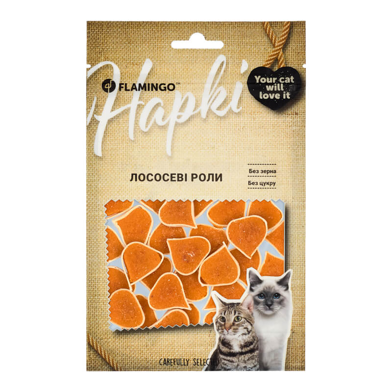 Ласощі Flamingo роли з м’ясом лосося для котів50 гУявіть ідеальний перекус для Вашого котика – м’які роли з ніжним м’ясом лосося від яких будь-який пухнастик просто не зможе відірватися!Ласощі Flamingo – це 100% натуральні інгредієнти, максимум користі та задоволення у кожному шматочку, а все тому, що ми знаємо секрет ідеального перекусу!Ласощі виготовляються методом делікатного сушіння за контрольованих температур, що дозволяє зберегти максимум поживних речовин, смаку та аромату.Завдяки цій технології закуски є натуральними, без додавання консервантів, з тривалим терміном зберігання.Важко відмовити улюбленцю в смачненькому? Ласощі Flamingo — чудовий вибір для щоденного частування!Чому варто обрати ласощі ТМ Flamingo?Високоякісний білокОсновою ласощів є натуральне м’ясо лосося (77%), курки (6,5%) та філе тріски (6%), які містять велику кількість білка тамінімальний вміст жиру, що робить їх ідеальним вибором для підтримки здоров’я та активності улюбленця.Вітамінний комплексМ’ясо курки, лосося та тріски у складі забезпечують повний спектр незамінних амінокислот, необхідних для м’язової сили, енергії та здорового обміну речовин. Дані інгредієнти багаті на вітаміни групи B (B6, B12), які містять залізо для запобігання анемії та цинк для здорової шкіри й шерсті. Риба, особливо лосось і тріска, є природним джерелом таурину, який життєво важливий для серця, зору та репродуктивного здоров’я, а також омега-3 жирних кислот, що забезпечують блискучу шерсть, спеціально важливих для котячого організму.М’яка текстураТекстура ласощів забезпечує комфортне поїдання без навантаження на щелепи, що ідеально підходить для котів будь-якого віку.Легке засвоєнняЗавдяки м’якій текстурі та складу ласощі легко перетравлюються, що робить їх ідеальним вибором для тварин з чутливим травленням.Безпечний складПродукт не містить глютену, цукру та штучних добавок, що мінімізує ризик виникнення алергічних реакцій.Надійне зберіганняВакуумна упаковка з поглиначем запаху та зручною zip-застібкою забезпечує довготривалу свіжість продукту.Склад: Лосось 77%, крохмаль батату 7,5%, курка 6,5%, тріска 6%, гліцерин 1,75%, рослинний білок 1%, сіль 0,25%.Добавки:Добавки технологічні:Сорбат калію 0,1%.Аналітичний склад: Сирі жири: 4,2%. Сирий протеїн: 28%. Сира зола: 3%. Сира клітковина: 1,5%. Вологість: 20%.Спосіб застосування:рекомендовано для тварин віком від 4 місяців.Рекомендації з годуваннямаксимальна добова норма (гр на день) 3 кг 3 – 5 кг 5 кг 10 15 20Застереження:не використовувати у разі індивідуальної непереносиності інгредієнтів. Продукт не є повноцінним харчуванням і має даватися виключно як доповнення до основного раціону.Умови зберігання:зберігати засіб у темному сухому приміщенні, окремо від харчових продуктів при температурі від 5 °С до 25 °С.Фасування:50 гТермін придатності:3 рокиТоргівельна марка:FlamingoКраїна виробник:Бельгія