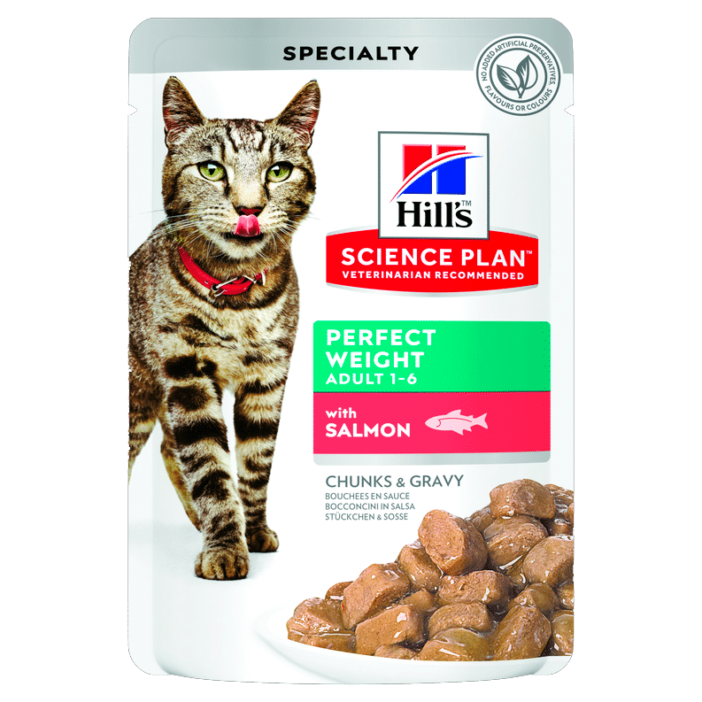 Вологий корм Hill’s SCIENCE PLAN Adult Perfect Weight рекомендований для підтримання оптимальної ваги у дорослих котів старше 1 року, що схильні до набору ваги або які страждають на ожиріння легкого ступеня (тобто для котів найменш активних, стерилізованих або схильних до набору ваги з інших причин).