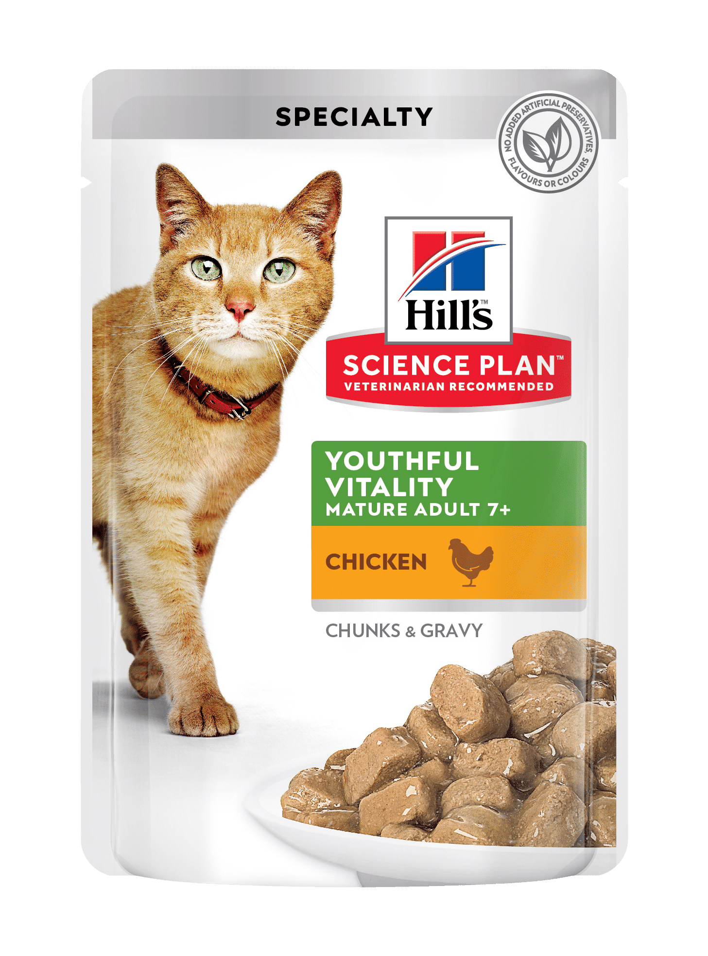 Вологий корм Hill’s SCIENCE PLAN Mature Adult 7+ Senior Vitality рекомендовано для котів віком від 7 років. Допомагає підтримувати належний рівень енергії, зміцнює імунітет і здоров’я життєво важливих органів котів зрілого віку.