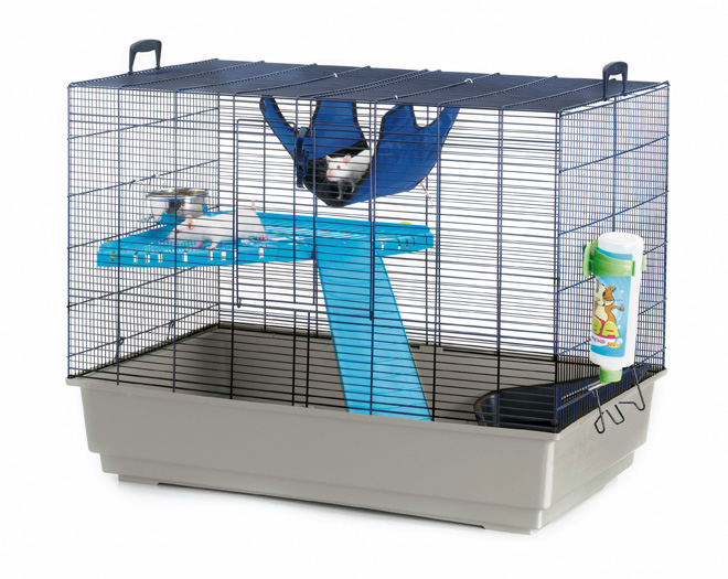 У комплект входять аксесуари: пластикова платформа, драбинка, миска для корму з нержавіючої сталі, гамак, напувалка та туалет.