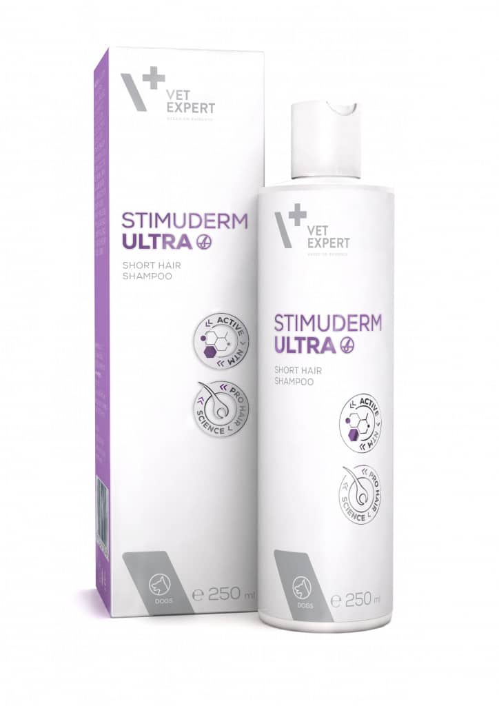 Vet Expert Стимудерм Ультра Шампунь для короткошерстих собак – це інноваційний дермокосметичний шампунь, рекомендований для основної частини шкіри та шерсті короткошерстих собак із надмірним випаданням шерсті різного походження та/або з ослабленою шерстю. Активною речовиною шампуню є запатентована молекула ACTIVE NTM з доведеною ефективністю у стимулюванні відростання шерсті. Продукт не містить SLS/SLES, парабенів, ароматизаторів, барвників. Підходить для чутливої шкіри.