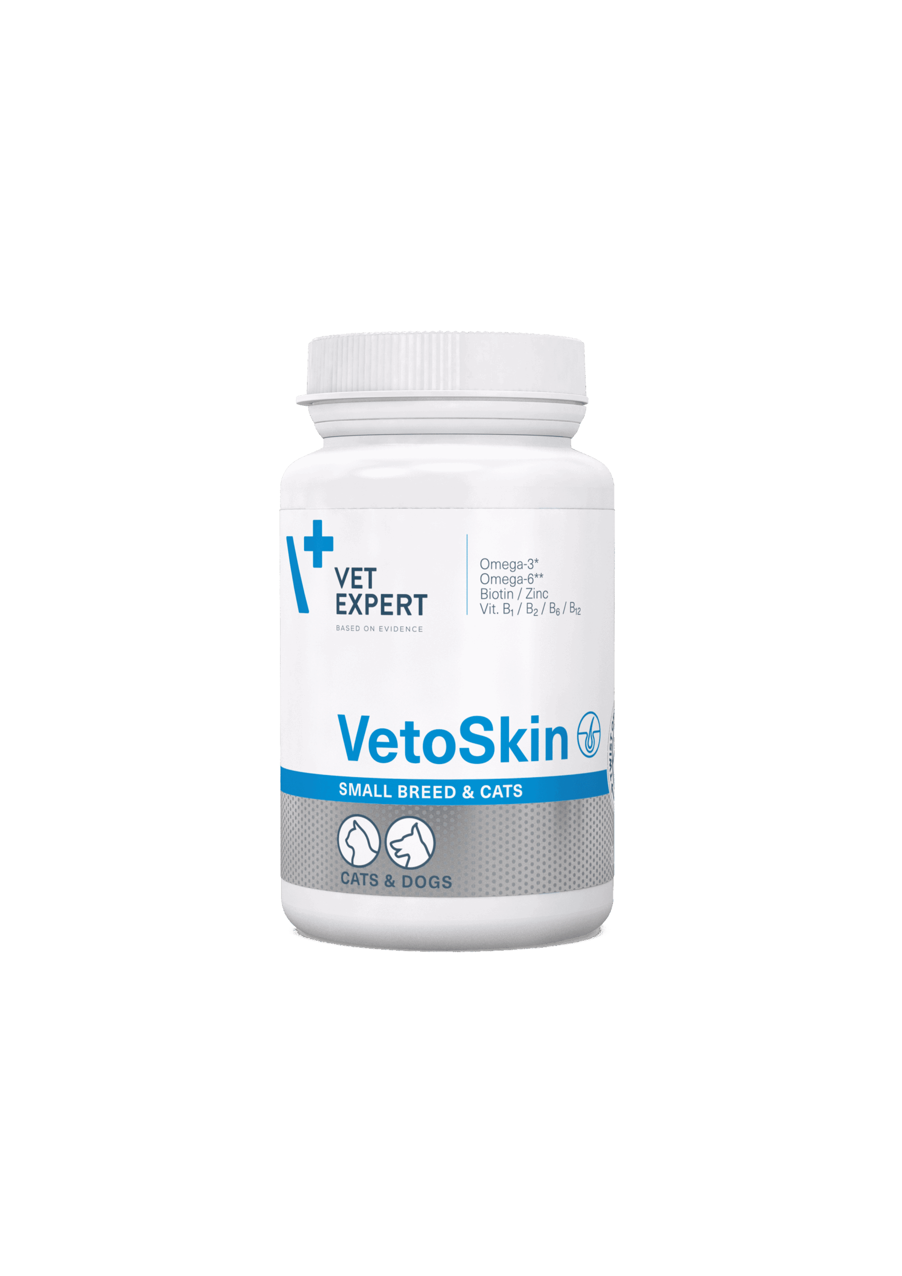 Харчова добавка для котів і собак із захворюваннями шкіри, які проявляються у вигляді сухої та тьмяної шерсті, випадінні шерсті та лущенні шкіри. Збалансований рівень омега-омега кислот містить весь необхідний склад для покращення функцій шкіри. Омега-6 жирні кислоти , такі як лінолева кислота (ЛК) і гамма-ліноленова кислота (ГЛК), підтримують водний баланс шкіри. Вони слугують будівельними блоками керамідів, які утворюють спеціальну прокладку в позаклітинному просторі, щоб запобігти витоку втрати води між клітинами епідермісу. Це допомагає запобігти сухості шкіри, забезпечуючи достатній рівень зволоженості та еластичності. Найкращими джерелами Омега-6 жирних кислот є олія огірочника та олія примули вечірньої.
