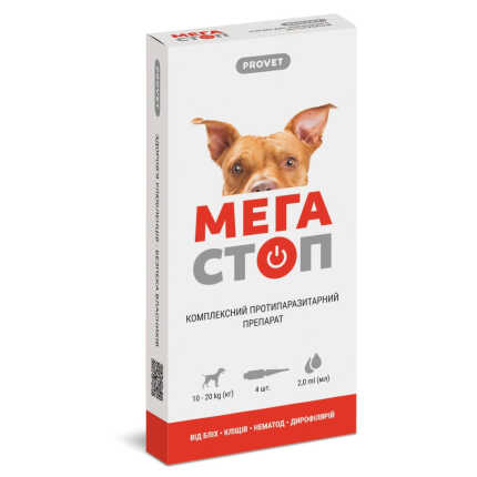 Краплі Provet МЕГАСТОП для собак від 10 до 20 кг від зовнішніх та внутрішніх паразитів 4 піпетки х 2 мл