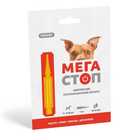 Краплі Provet МЕГАСТОП для собак від 10 до 20 кг від зовнішніх та внутрішніх паразитів 1 піпетка х 2 мл