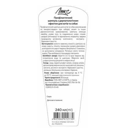 Шампунь Люкс для котів та собак профілактичний з дерматологічним ефектом 240 мл