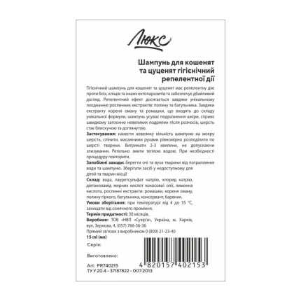 Шампунь Люкс для котів та собак гігієнічний репелентної дії 15 мл