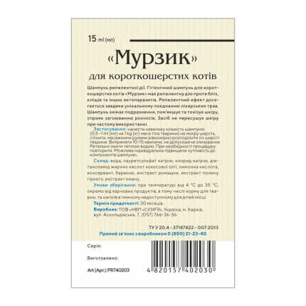 Шампунь Мурзик для короткошерстих котов від бліх та кліщів репелентний 15 мл