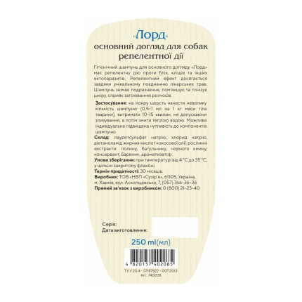 Шампунь Лорд для собак від бліх та кліщів репелентний 250 мл